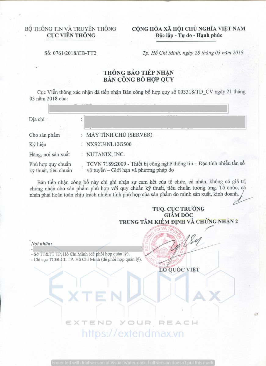 Giấy "Thông báo tiếp nhận bản Công bố hợp quy" cho Máy tính chủ