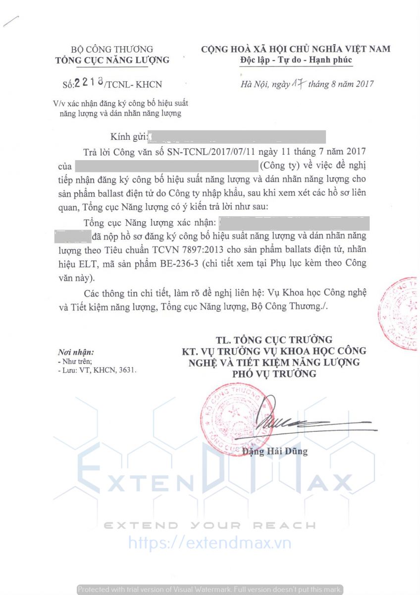 3. Mẫu giấy tiếp nhận Công bố năng lượng cho chấn lưu điện từ và chấn lưu điện tử dùng cho bóng đèn huỳnh quang