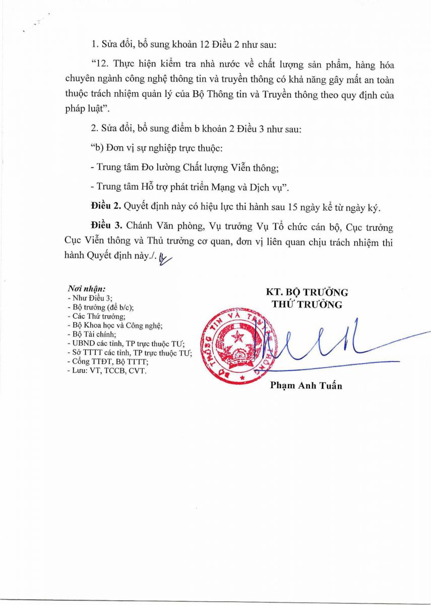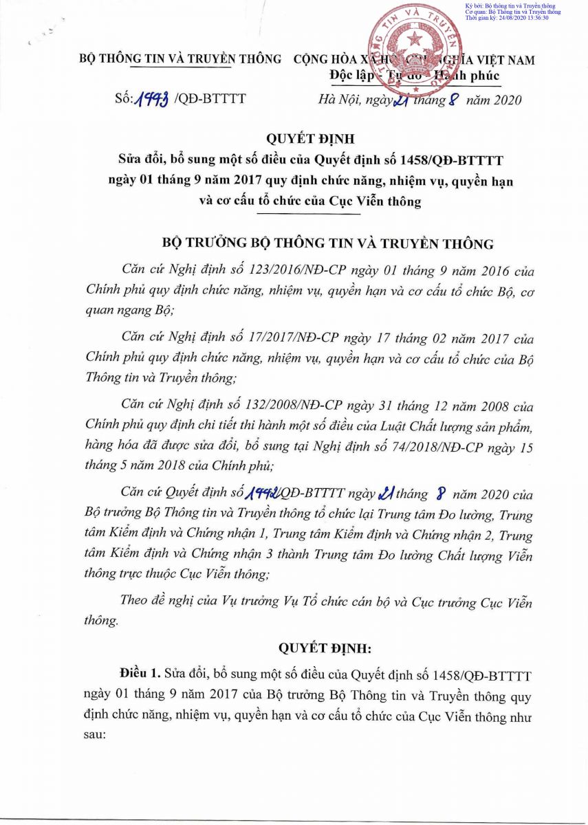 Ngày 21/08/2020 Bộ TT&TT ban hành Quyết định số 1443/QĐ-BTTTT, có đề cập đến Quyết định số 1442/QĐ-BTTTT ban hành cùng ngày về việc "tổ chức lại Trung tâm Đo lượng, Trung tâm Kiểm định và Chứng nhận 1, Trung tâm Kiểm định và Chứng nhận 2, Trung tâm Kiểm định và Chứng nhận 3 thành Trung tâm Đo lường Chất lượng Viễn thông trực thuộc Cục Viễn thông".