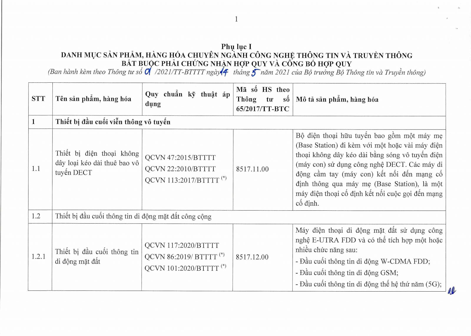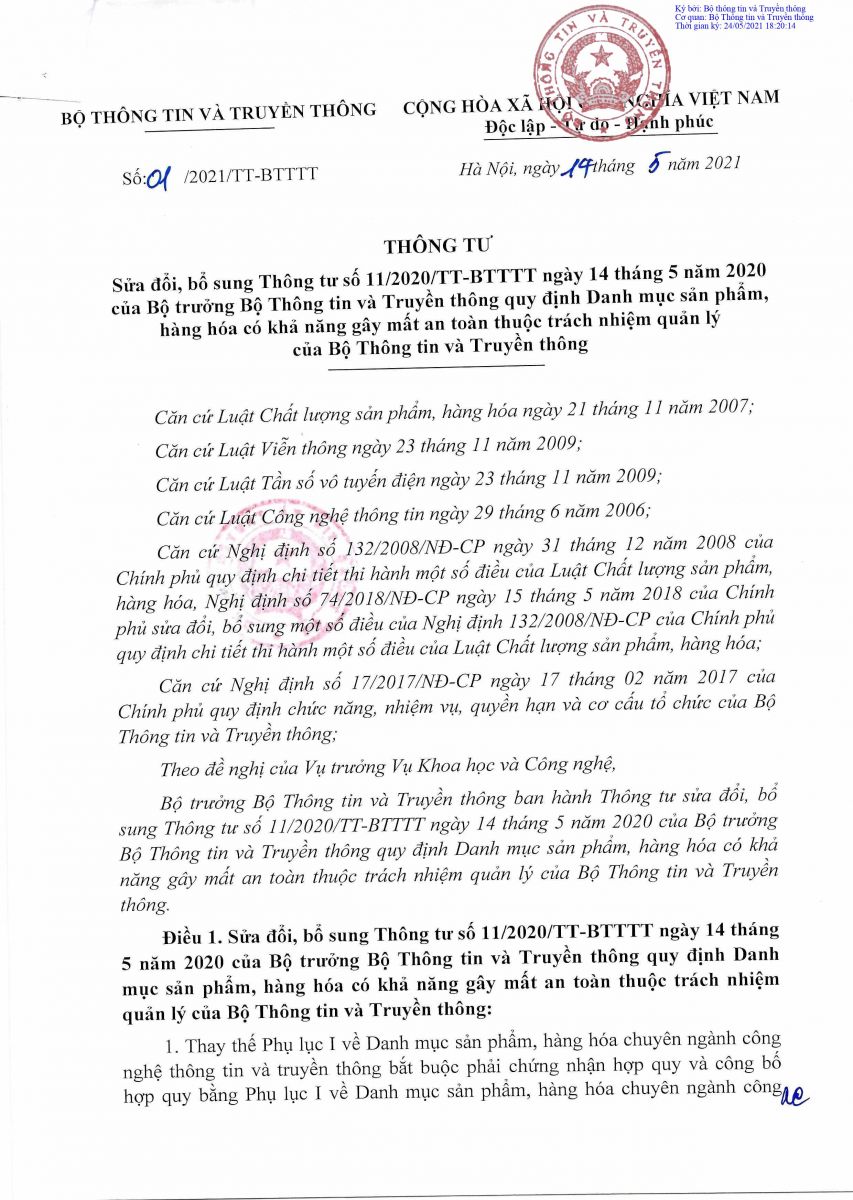 EXTENDMAX - Bộ Thông tin và Truyền thông đã chính thức ban hành Thông tư số 01/2021/TT-BTTTT ký ngày 14/05/2021 để sửa đổi và bổ sung Thông tư số 11/2020/TT-BTTTT - Quy định danh mục sản phẩm, hàng hóa có khả năng gây mất an toàn thuộc trách nhiệm quản lý của Bộ Thông tin và Truyền thông (Danh mục thiết bị bắt buộc phải Chứng nhận hợp quy và Công bố hợp quy Bộ Thông tin Truyền thông - Cục Viễn Thông). Thông tư 01/2021/TT-BTTTT sẽ có hiệu lực kể từ ngày 01/07/2021 cùng một số quy chuẩn kỹ thuật quốc gia Bộ TT&TT đã ban hành trong năm 2021.