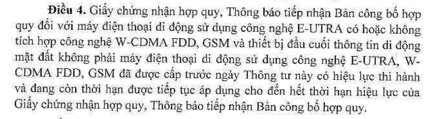 → Trong khi đó, giấy chứng nhận hợp quy, thông báo tiếp nhận bản công bố hợp quy đã cấp cho máy điện thoại di động và các thiết bị đầu cuối thông tin di động mặt đất chứng nhận cho QCVN 12:2015/BTTTT, QCVN 15:2015/BTTTT, QCVN 117:2018/BTTTT (nhưng không bao gồm QCVN 54:2011/BTTTT hoặc QCVN 101:2016/BTTTT) là một trường hợp đặc biệt, sẽ được tiếp tục áp dụng cho đến khi hết hiệu lực căn cứ theo Điều 4 của Thông tư 43/2021/TT-BTTTT.