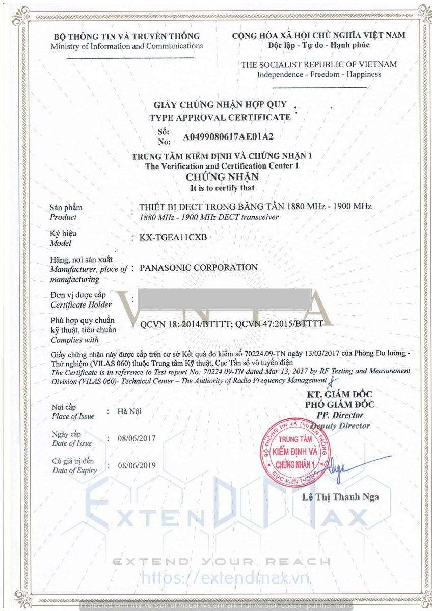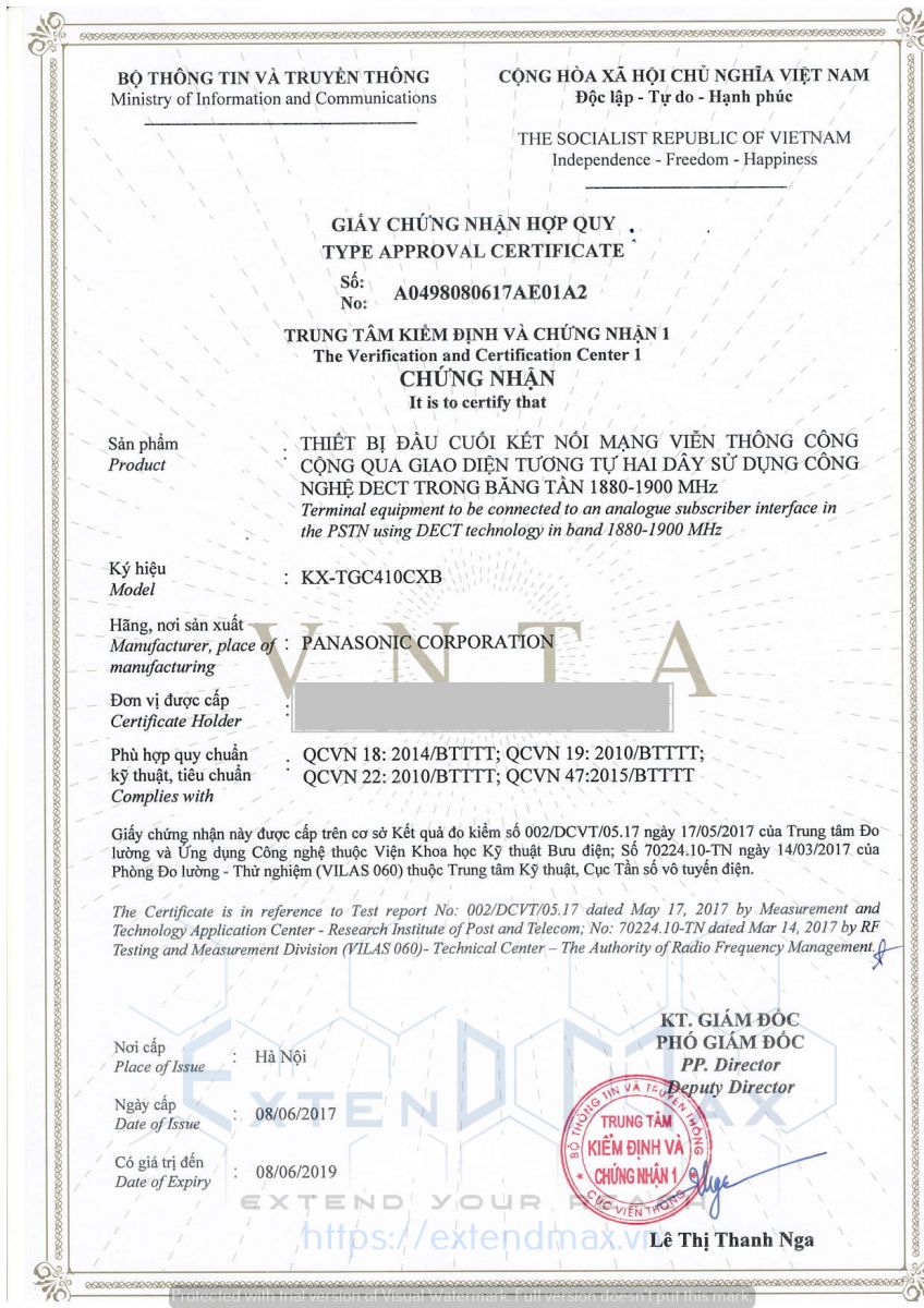 EXTENDMAX - Điện thoại không dây sử dụng công nghệ DECT nhập khẩu hoặc sản xuất để bán cho thị trường Việt Nam phải Đăng ký kiểm tra chất lượng nhà nước, Chứng nhận hợp quy, Công bố hợp quy tại Cục Viễn Thông theo quy định của Bộ Thông tin và Truyền thông tại thông tư quy định danh mục hàng hoá nhóm 2 thuộc phạm vi quản lý của Bộ Thông tin và Truyền thông (danh mục thiết bị bắt buộc phải Chứng nhận hợp quy và Công bố hợp quy), hiện hành là Thông tư 04/2023/TT-BTTTTT (hoặc phiên bản thay thế Thông tư 04/2023/TT-BTTTT trong tương lai).