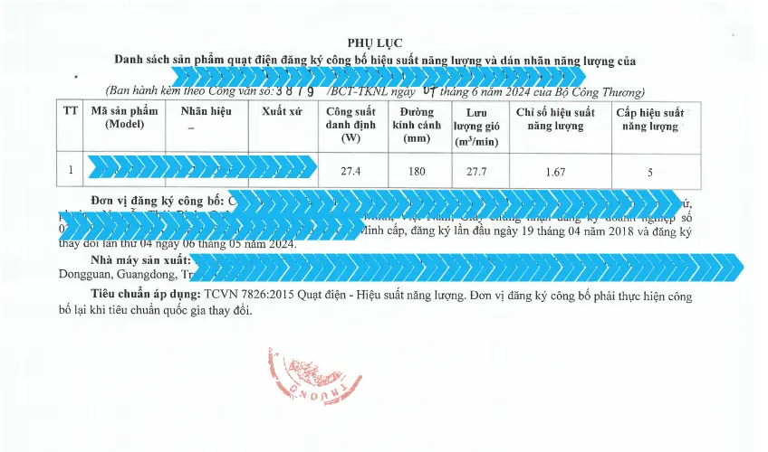 Mẫu văn bản tiếp nhận Công bố dán nhãn năng lượng cho quạt điện