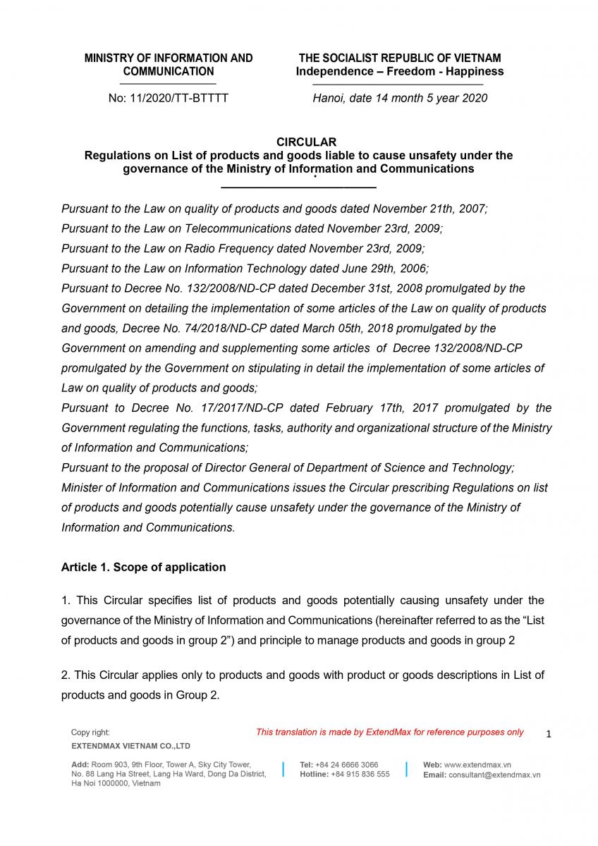 EXTENDMAX - MIC Vietnam has officially released Circular No. 11/2020/TT-BTTTT to replace Circular No. 05/2019/TT-BTTTT - Regulations on list of products subjected to MIC Type Approval certification and Declaration of Conformity. The new Circular 11/2020/TT-BTTTT shall take effect from July 01, 2020 together with several new National Technical Regulations and Circular 10/2020/TT-BTTTT which are introduced by MIC Vietnam recently.