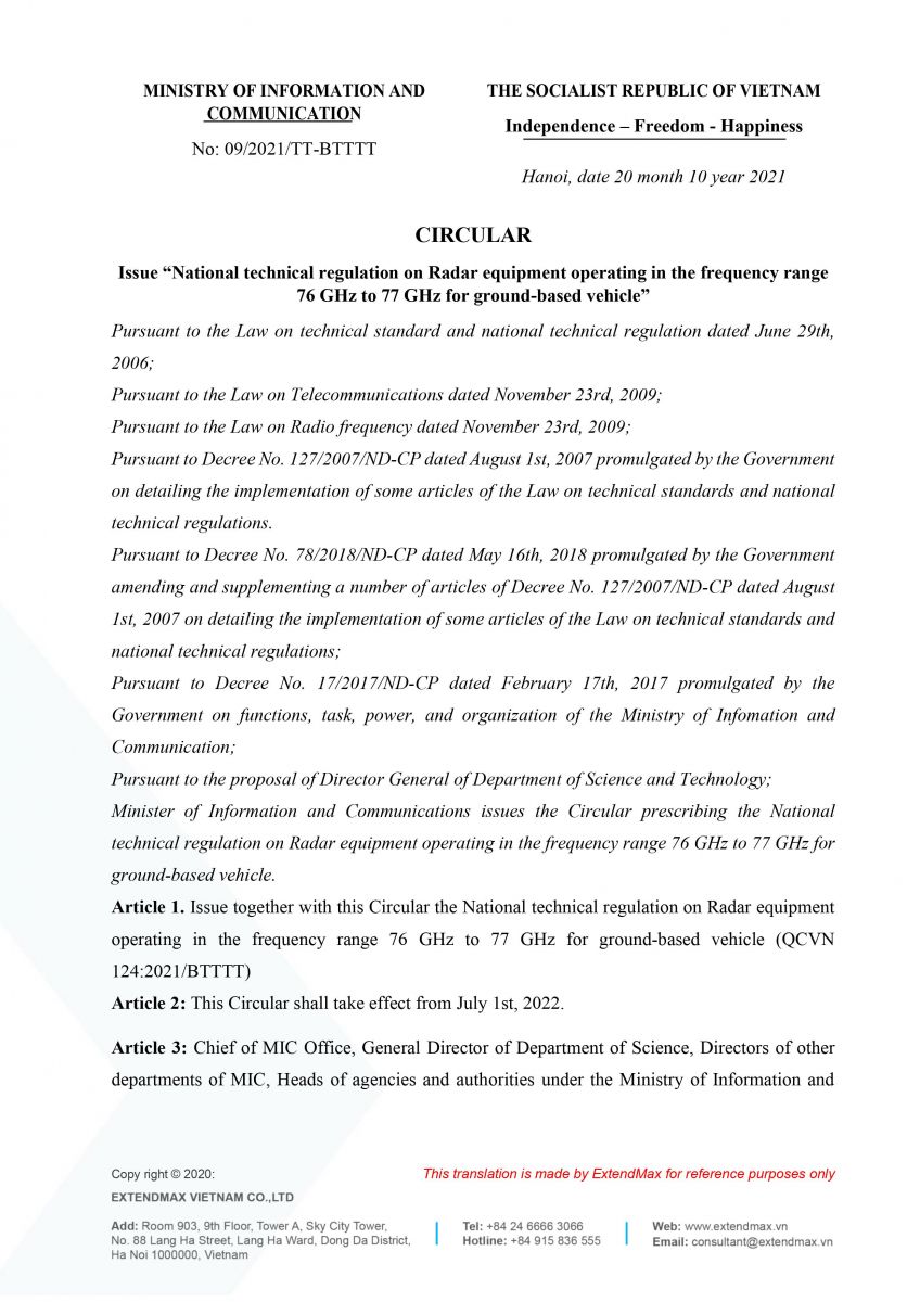 1) Vehicle radar 76 ~ 77 GHz need to comply with QCVN 124:2021/BTTTT and EMC QCVN 18:2014/BTTTT.