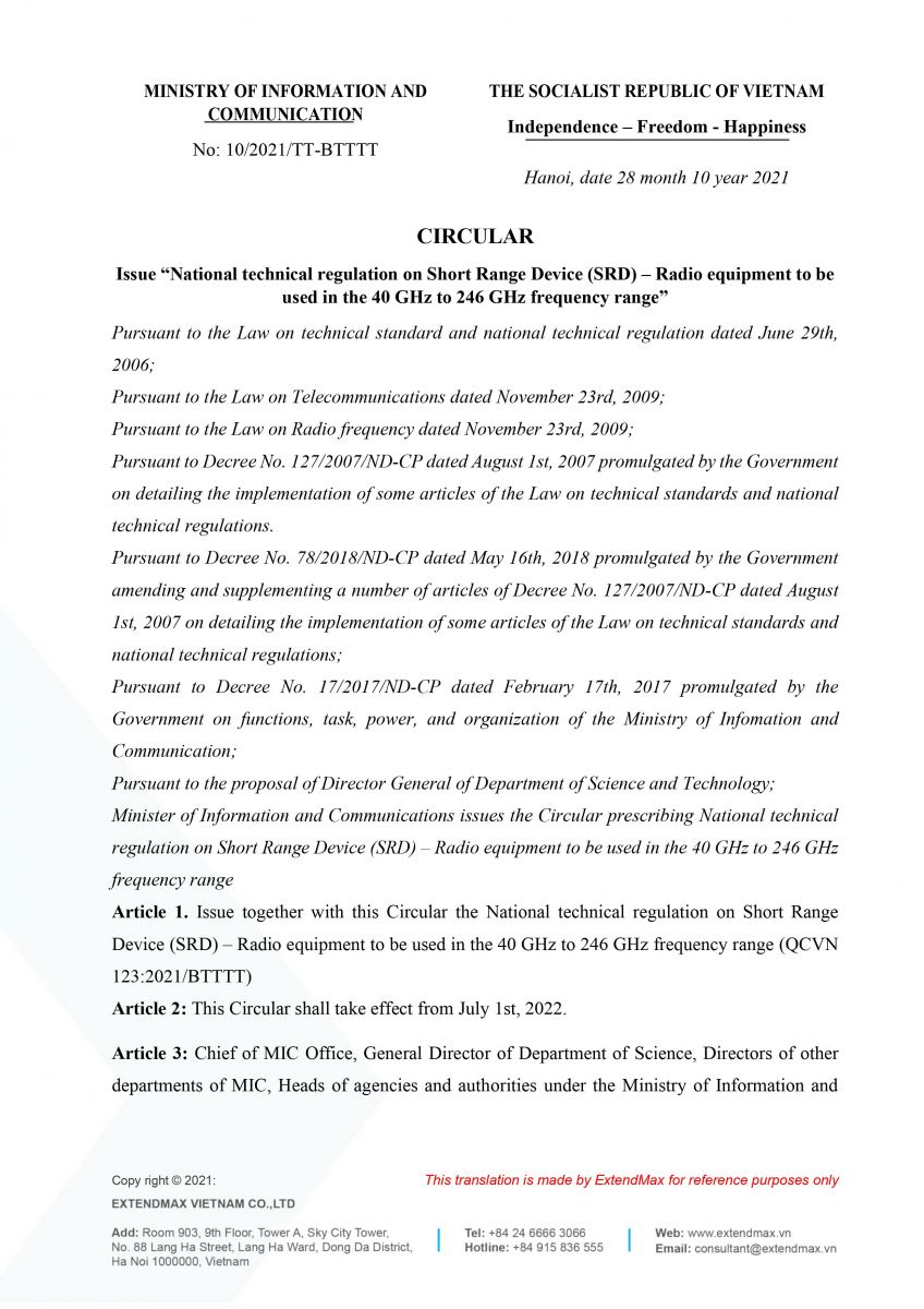 2) QCVN 123:2021/BTTT: National technical regulation on Short Range Device (SRD) – Radio equipment to be used in the 40 GHz to 246 GHz frequency range