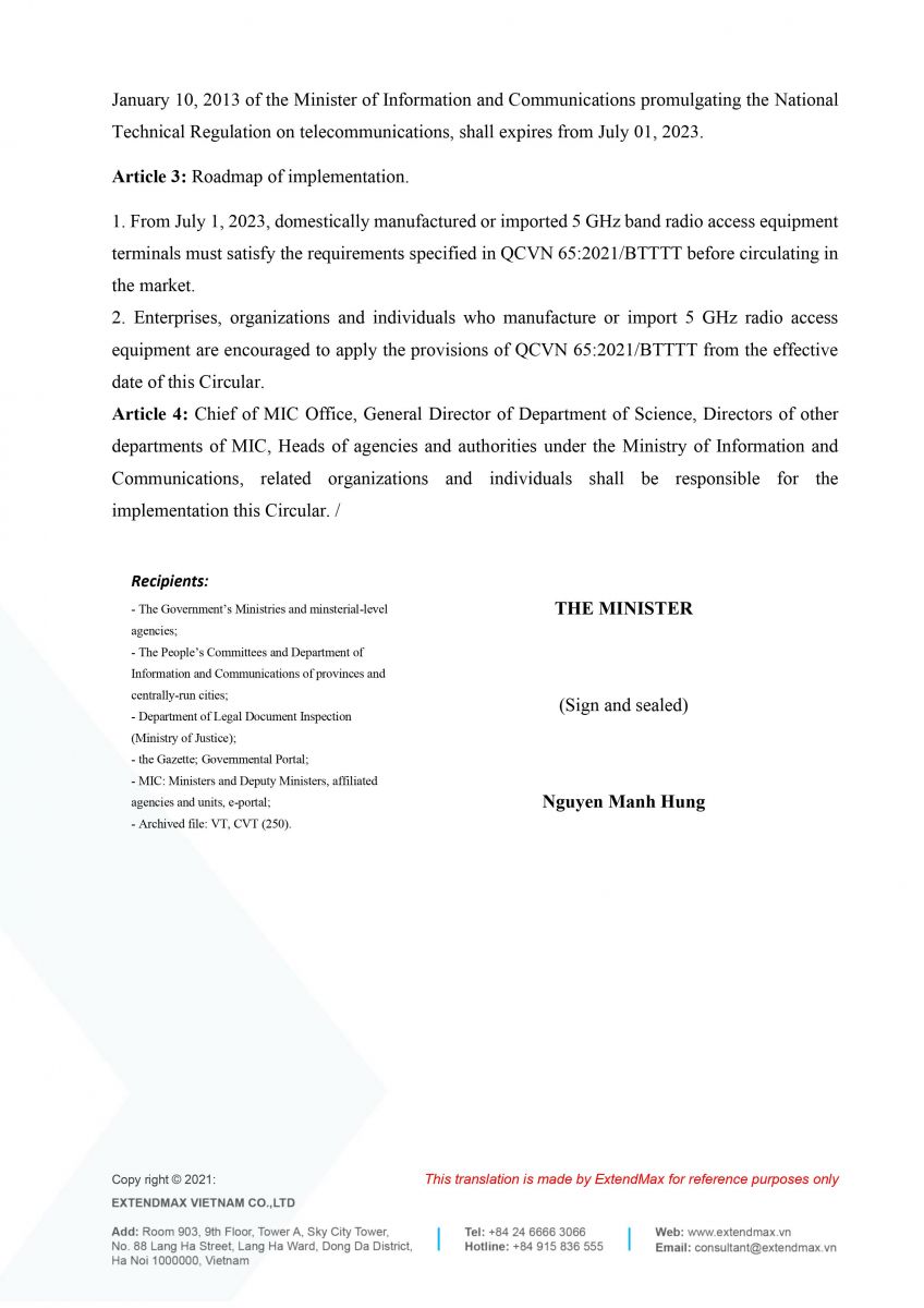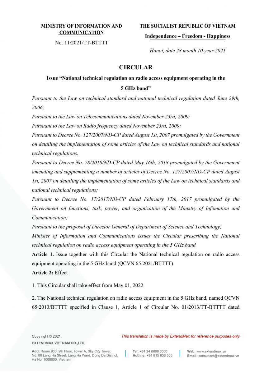 1) QCVN 65:2021/BTTTT: National technical regulation on radio access equipment operating in the 5GHz band