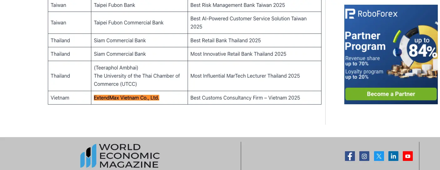 EXTENDMAX – 02/02/2025 – ExtendMax Vietnam Co., Ltd. is proud to announce that we have been honored with the World Economic Magazine Award, receiving the title of Best Customs Consultancy Firm - Vietnam 2025. This marks another significant milestone, reaffirming ExtendMax's leading position and outstanding professionalism in supporting both domestic and international clients with customs procedures and compliance services.